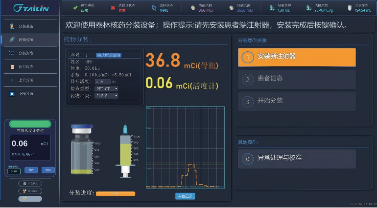 泰林正電子藥物分裝機(jī)具有自動(dòng)分裝核藥功能,能根據(jù)臨床需求活度劑量將母液分裝至注射器,尤其適合正電子藥物分裝。